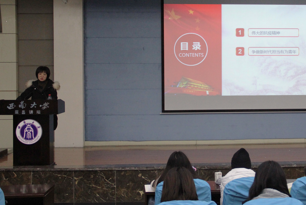 贺老师以“弘扬伟大抗疫精神,争做新时代担当有为青年”为主题,从伟大的抗疫精神和争做新时代担当有为青年两个方面进行了讲述。她指出:伟大的抗疫精神是守望相助、同舟共济的精神;是尊重规律、求真务实的精神;是敢于斗争、敢于胜利的精神;是命运与共、共克时艰的精神。希望全体学员深入学习贯彻习近平总书记在全国抗击新冠肺炎疫情表彰大会上的重要讲话,坚定中国特色社会主义道路自信、理论自信、制度自信、文化自信,弘扬伟大的抗疫精神,做勇担时代重任的新时代青年!