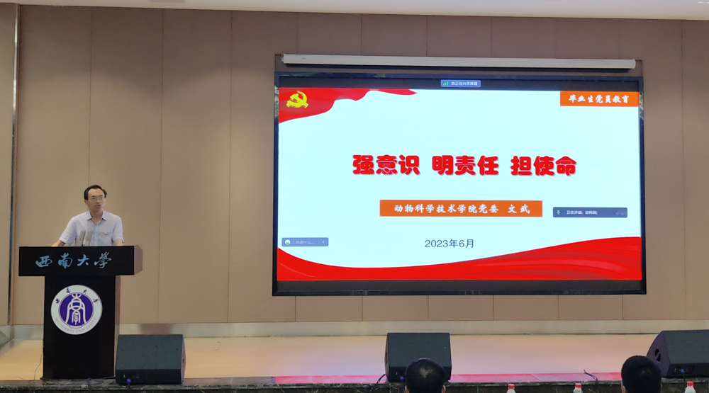 为深入学习贯彻习近平新时代中国特色社会主义思想,加强毕业生党员教育,提高毕业生党员的思想觉悟、党员意识、党性修养和社会责任感,学院党委于6月2日下午分荣昌、北碚两个会场同步视频召开2023届毕业生党员集中教育大会。党委副书记、纪委书记文武,全体学生党支部书记及2023届毕业生党员参加了会议。会议由组织员贺春湘主持。